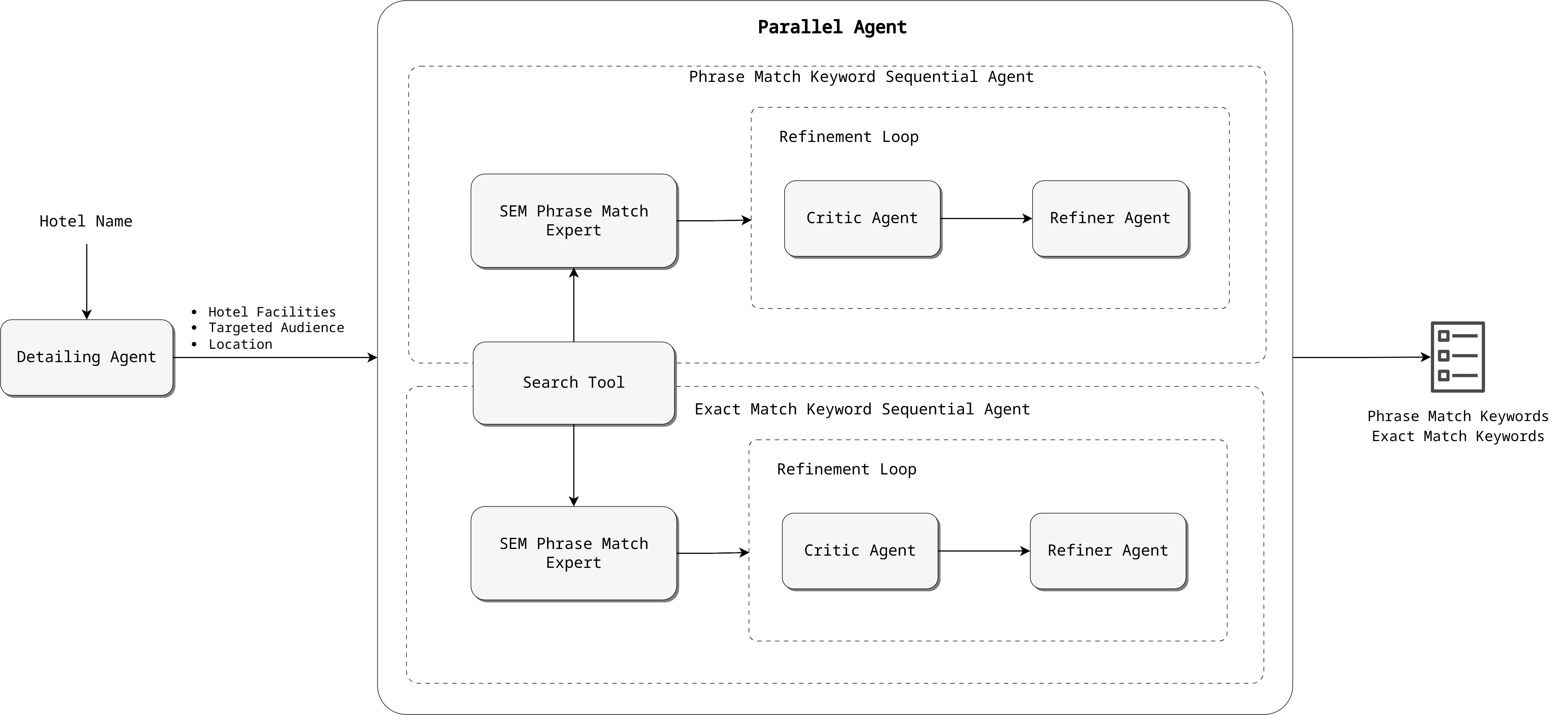 After a deep dive into the problem, we recognized that effective keyword generation required more than just automation; it needed expertise, context, and a nuanced understanding of search intent. We moved beyond simple scripts and architected a complex, multi-agent system designed to replicate and scale the strategic thinking of an expert SEM analyst.