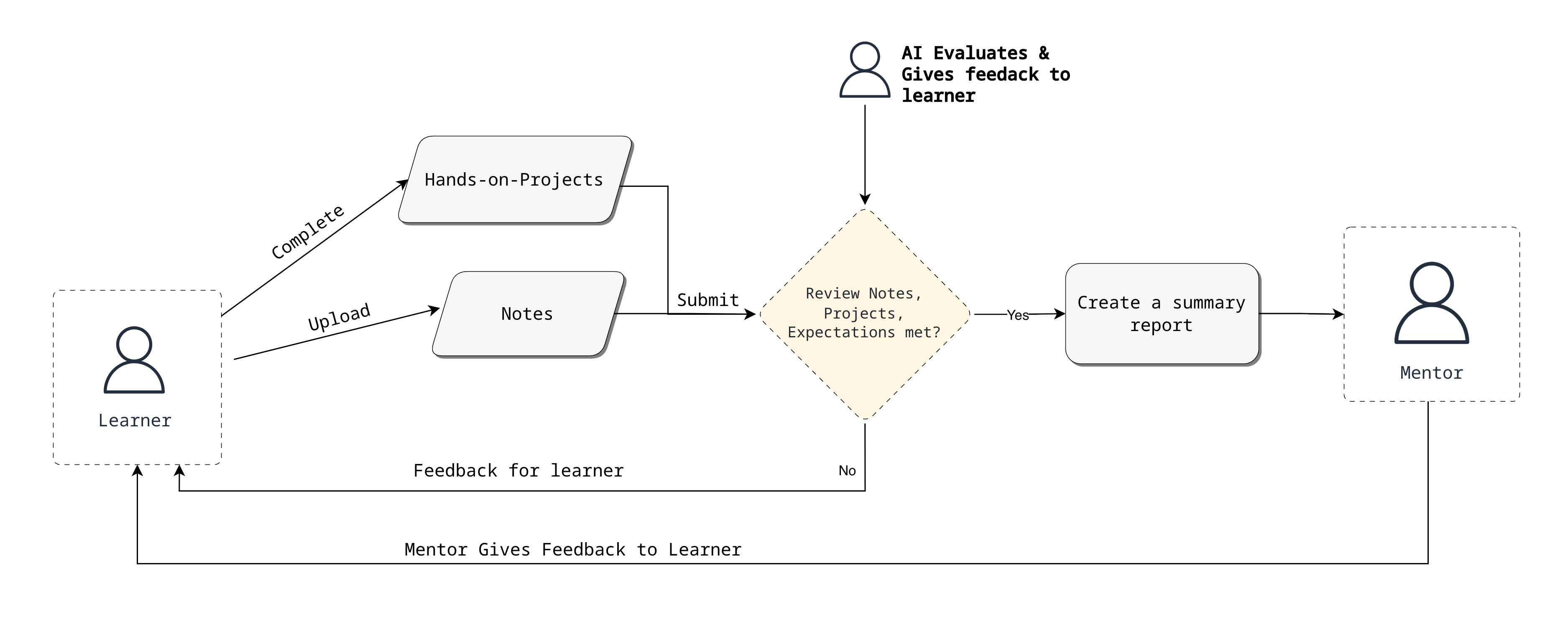 If the AI determines the notes sufficiently cover the required concepts, the module is marked as complete. However, if key concepts are missing, the AI initiates a dialogue, asking the specific questions the course designer had prepared. It assesses the learner's responses, provides further feedback to solidify their understanding, and only then marks the module as complete. Upon completion, the AI generates a concise summary report for the mentor, detailing the learner's performance.